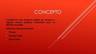 El documento describe entornos para compartir recursos como Picasa, Teacher tube y Slide share, los cuales constituyen una gran fuente de recursos y lugares para publicar materiales con el fin de difundirlos a nivel mundial. El documento también incluye los nombres de Kevin Ávila y Juan Benavides.