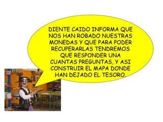 El documento habla sobre un juego en el que un pirata informa que han robado las monedas del jugador y que para recuperarlas debe responder preguntas sobre piratas para construir un mapa hacia el tesoro escondido. Las preguntas tratan sobre los colores y símbolos de las banderas piratas, sus armas, barcos, provisiones, mares navegados y piratas famosos como Barbarroja. Al completar el cuestionario, el jugador obtiene el mapa para encontrar el tesoro.