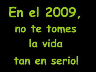 El documento ofrece una lista de actividades relajadas y divertidas para hacer en 2009 como bailar, descansar, ir de compras, dormir, besar, relajarse en la naturaleza, atreverse, reír, hacer nuevos amigos, probar nuevos platos de cocina, gritar, tomar un baño de espuma y ser feliz para no tomarse la vida tan en serio.