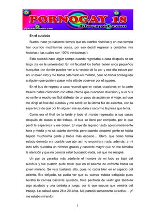 El documento describe un encuentro sexual entre el narrador y un hombre atractivo en el autobús de regreso a casa desde la universidad. En el autobús, el hombre se sienta junto al narrador y le permite practicarle sexo oral, corriéndose en su boca. Semanas más tarde, el narrador descubre que el hombre es el prometido de la hermana de una vecina, quien lo reconoce con una sonrisa.