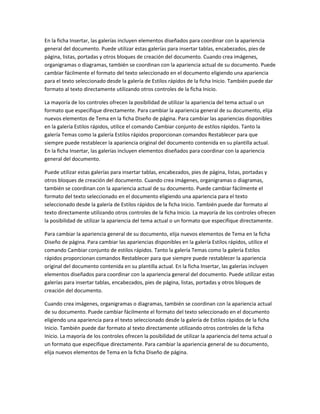 El documento detalla el uso de las galerías en la ficha insertar para coordinar la apariencia de elementos como tablas, encabezados y diagramas en un documento. También señala la posibilidad de cambiar el formato del texto utilizando la galería de estilos rápidos y otros controles en la ficha inicio. Además, se indica cómo restablecer la apariencia original y seleccionar nuevos elementos de tema en la ficha diseño de página.