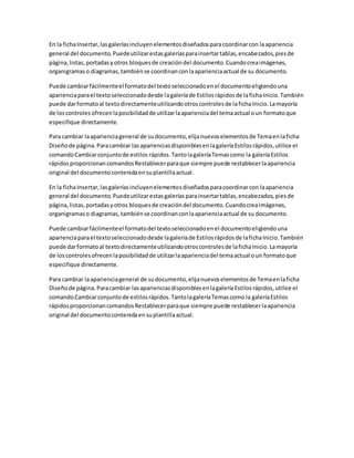 El documento describe las galerías y controles en la ficha Insertar y la ficha Inicio que permiten dar formato al texto y cambiar la apariencia general del documento. Estas herramientas incluyen elementos para coordinar la inserción de tablas, encabezados, pies de página y otros bloques con la apariencia del documento. También es posible cambiar fácilmente el formato del texto seleccionado o dar formato directamente utilizando controles que ofrecen la posibilidad de utilizar la apariencia del tema actual o uno personalizado.