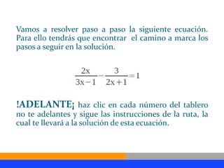 El documento describe los pasos para resolver una ecuación de segundo grado a través de un juego interactivo con 10 pasos. El jugador debe hacer clic en las casillas correctas para avanzar en la solución, recibiendo pistas y retroalimentación después de cada paso. El objetivo final es llegar a la solución completa de la ecuación.