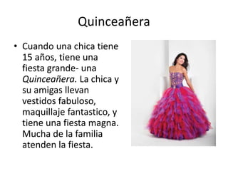 Una Quinceañera es una gran fiesta para una chica que cumple 15 años, donde lleva un hermoso vestido y maquillaje, baila con su padrino, y recibe regalos rodeada de familia y amigos. La familia prepara una variedad de comidas típicas y postres para los invitados. Aunque es una celebración costosa, marca el paso de la chica a la adultez.