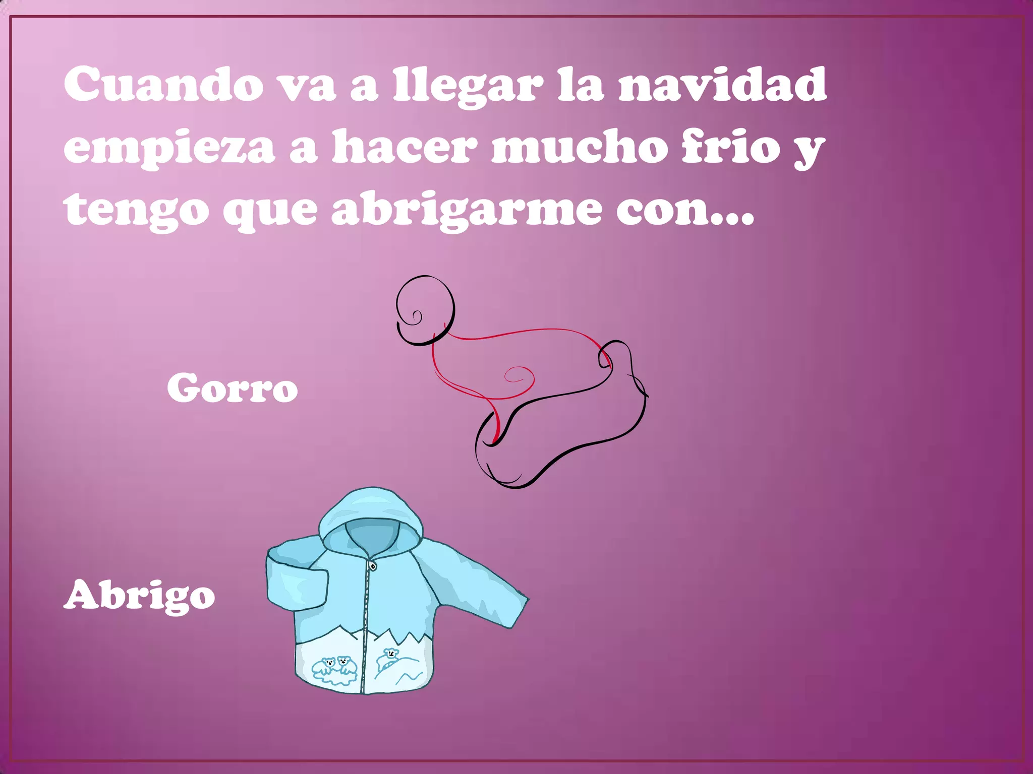 El documento describe las tradiciones y actividades navideñas como abrigarse con gorros, bufandas y abrigos para jugar en la nieve con amigos, encender la calefacción o chimenea en casa, decorar el árbol y belén, enviar felicitaciones y cartas a los reyes magos, comer turrón, gambas y roscón, y celebrar el nacimiento de Jesús. Papá Noel y los Reyes Magos traen regalos a los niños que se portan bien.