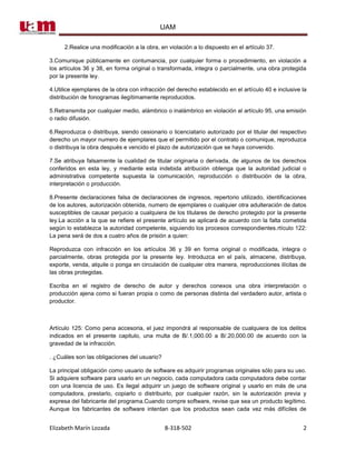 El documento trata sobre la protección de los derechos de autor en Panamá. Brevemente resume que la Constitución de 1904 ya reconocía los derechos de autor. La ley actual de 1994 protege expresamente los programas de computadora y establece sanciones civiles y penales para violaciones a los derechos de autor de software. También describe las obligaciones de los usuarios de software y los esfuerzos del gobierno panameño para combatir la piratería.