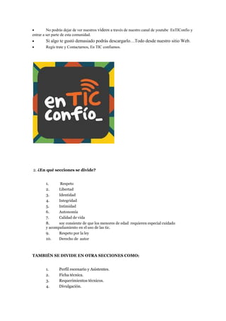 El documento presenta la Política Nacional de Uso Responsable de las TIC "En TIC Confió" del Ministerio de Tecnologías de la Información y las Comunicaciones de Colombia. El objetivo es promover la confianza y seguridad en el uso de las TIC en el país mediante la promoción de usos productivos, creativos, seguros y responsables. El sitio web de "En TIC Confió" ofrece información sobre el uso seguro de las TIC, riesgos comunes, noticias y casos de éxito.