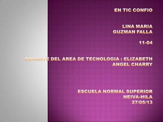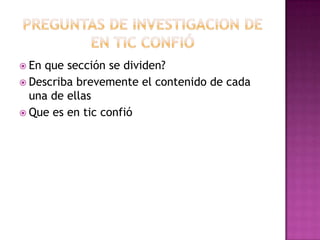 El documento describe la sección de un sitio web llamado En TIC Confío, dividiéndose en seis secciones que cubren temas como las últimas noticias de tecnología, ciberacoso, ciberdependencia, delitos informáticos, sexting y grooming, y denuncia de pornografía infantil. El sitio busca promover el uso responsable y seguro de las tecnologías de la información y la comunicación en Colombia.