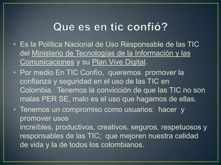 El documento presenta la política nacional de uso responsable de las tecnologías de la información y comunicación (TIC) en Colombia. Promueve la confianza y seguridad en el uso de las TIC y hace un compromiso de usarlas de manera increíble, productiva, creativa, segura, respetuosa y responsable. Además, define términos como pornografía infantil, sexting, grooming, nomofobia y ciberacoso, y advierte sobre los peligros de confiar en personas desconocidas en internet.