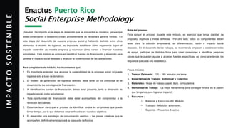 Este documento se enfoca en identificar fuentes de financiación y desarrollo para generar impacto social y alcanzar la sostenibilidad de operaciones de una empresa social. Explica que es importante entender que la sostenibilidad no se logra solo con donativos, y que el modelo de generación de ingresos debe guiar las estrategias de financiación. También enfatiza la importancia de tener claros los objetivos, la solución empresarial y el impacto social deseado al buscar fondos.