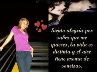 El documento expresa la alegría que siente el autor por amar y ser amado por la persona a la que va dirigido. Describe cómo el amor que siente le da felicidad y le hace ver la vida de manera positiva, incluso cuando enfrenta tristezas. Concluye diciendo que se acostará con alegría sabiendo que es amado por esa persona.