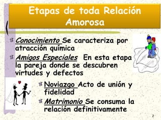 El documento describe las etapas de una relación amorosa, incluyendo el conocimiento, noviazgo y matrimonio. Explica la diferencia entre ilusión y enamoramiento, señalando que el enamoramiento implica un proceso de mutuo conocimiento. También describe los cambios químicos en el cerebro que ocurren cuando alguien se enamora, como la liberación de dopamina y otras sustancias. Finalmente, advierte sobre las características de una relación sentimental destructiva basada en los atributos físicos y la manipulación de
