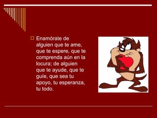 El documento ofrece consejos sobre enamorarse de alguien que te ame y te trate bien en lugar de enamorarse del amor en sí mismo. Recomienda encontrar a alguien que sea fiel, te comprenda, te apoye en los momentos difíciles, y camine a tu lado de forma comprometida.