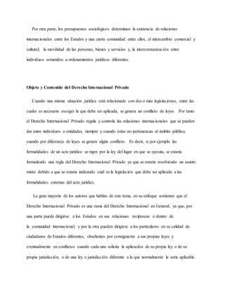 El Derecho Internacional Privado comprende normas para resolver conflictos de leyes que surgen cuando una situación jurídica involucra elementos de dos o más sistemas legales. Busca armonizar normas de diferentes estados cuando concurren en una relación jurídica para garantizar la seguridad de los derechos en el orden internacional. Incluye temas como la nacionalidad, condición jurídica de extranjeros, conflicto de leyes y conflicto de jurisdicciones, aplicándose principalmente en derecho privado.