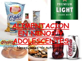 El documento aborda la importancia de la educación nutricional en la infancia y adolescencia, destacando sus necesidades físicas, cognitivas y socioemocionales. Se enfatiza la relevancia de una alimentación adecuada y el establecimiento de hábitos saludables durante estas etapas, especialmente ante el aumento de problemas como la insatisfacción corporal y los desórdenes alimentarios. Además, se mencionan cambios en los hábitos de consumo, la influencia de la publicidad y la necesidad de involucrar a la familia en la alimentación de los adolescentes.