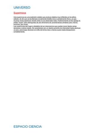 Una supernova es una explosión estelar extremadamente brillante que produce un destello de luz que puede durar semanas o meses, aumentando rápidamente de intensidad hasta alcanzar un pico y luego desvanecerse gradualmente hasta desaparecer. Inicialmente se les llamó novas, pero luego se les agregó el prefijo "super" para distinguirlas de explosiones estelares menos luminosas.