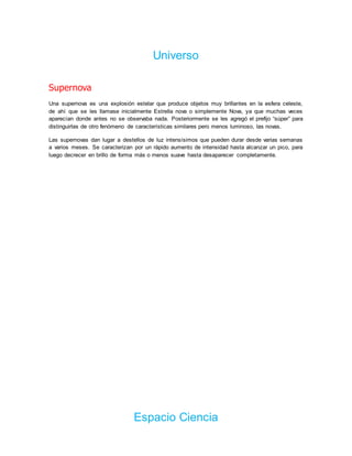 Una supernova es una explosión estelar extremadamente brillante que puede durar semanas o meses. Inicialmente se llamaban novas porque aparecían donde antes no había estrellas, pero luego se les agregó el prefijo "súper" para distinguirlas de las novas menos luminosas. Las supernovas muestran un rápido aumento de brillo hasta alcanzar un pico antes de decrecer gradualmente en intensidad hasta desaparecer.