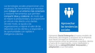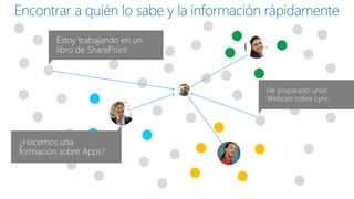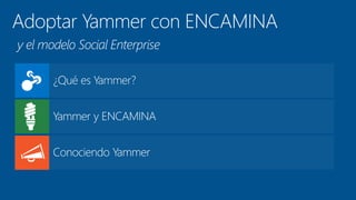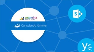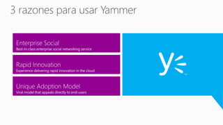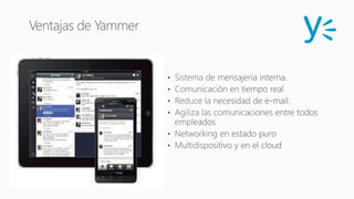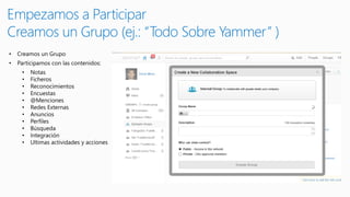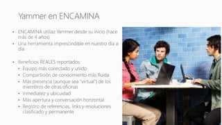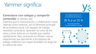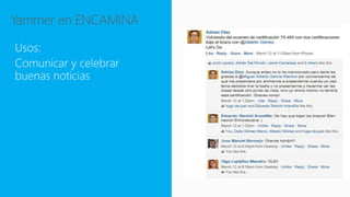 El documento habla sobre el uso de Yammer como una herramienta de colaboración en el lugar de trabajo. Yammer puede mejorar la productividad y comunicación entre departamentos como Marketing, Ventas, Soporte Técnico, permitiendo la creación de grupos, debates y comunicación entre empleados. La implementación de Yammer requiere gestionar el cambio, apoyar su uso y desplegarlo adecuadamente en la empresa.