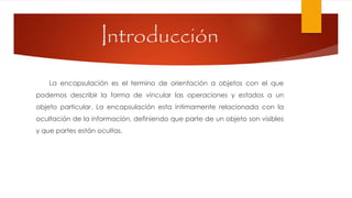 La encapsulación oculta cómo se implementa el estado de un objeto y solo permite acceder a este estado a través de métodos públicos. Los métodos de acceso como getters y setters permiten obtener y establecer valores de atributos privados de forma segura. La encapsulación garantiza la integridad de los datos al ocultar la implementación interna y exponer solo una interfaz pública.