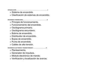 El documento describe los diferentes tipos de sistemas de encendido para motores de combustión interna, incluyendo el encendido convencional, el encendido electrónico transistorizado, el encendido electrónico integral y el encendido electrónico estático. Explica el funcionamiento de cada uno y los componentes clave como la bobina de encendido, el distribuidor, las bujías y los sensores electrónicos.