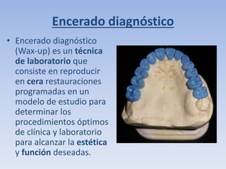 El documento describe los pasos para realizar un encerado diagnóstico, incluyendo la toma de impresiones, obtención de modelos de estudio, montaje de los modelos, y análisis estético de la relación dentolabial y características dentales individuales. El encerado diagnóstico permite reproducir restauraciones propuestas en cera para determinar los procedimientos óptimos para lograr la estética y función deseadas.