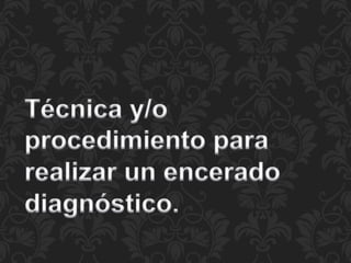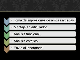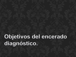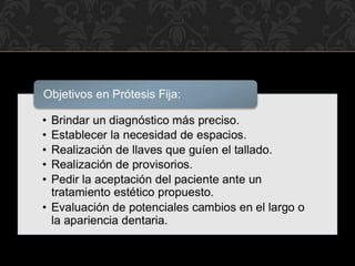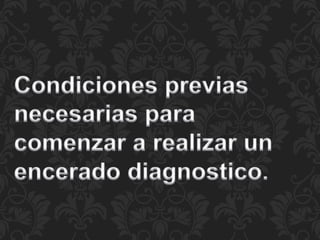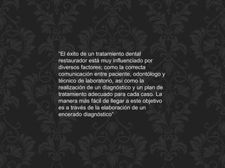 El éxito de un tratamiento dental restaurador depende de factores como la comunicación entre el paciente, odontólogo y técnico, así como un diagnóstico y plan de tratamiento adecuado para cada caso. La manera más fácil de lograr esto es a través de la elaboración de un encerado diagnóstico, el cual reproduce las restauraciones previstas en un modelo de estudio para determinar los procedimientos óptimos. La articulación de los dientes artificiales debe reflejar lo más exactamente posible la situación de los dientes naturales para lograr una