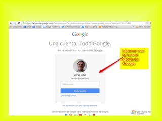 Este documento proporciona instrucciones para encontrar formularios en Google, comenzando con acceder a www.google.com e iniciar sesión en una cuenta de Google existente para luego acceder a formularios vacíos. Se recomienda registrarse en una cuenta de Google para evitar posibles inconvenientes con cuentas de otros servicios.