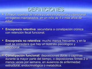 Este documento define la encopresis y describe sus tipos, epidemiología, criterios de diagnóstico, exámenes complementarios y tratamiento. La encopresis es la emisión repetida de heces en lugares inadecuados en niños mayores de 4 años. Puede ser retentiva, asociada a estreñimiento, o no retentiva, con un componente psicológico. El tratamiento incluye desimpactación, educación, prevención de recaídas y seguimiento multidisciplinario a largo plazo.