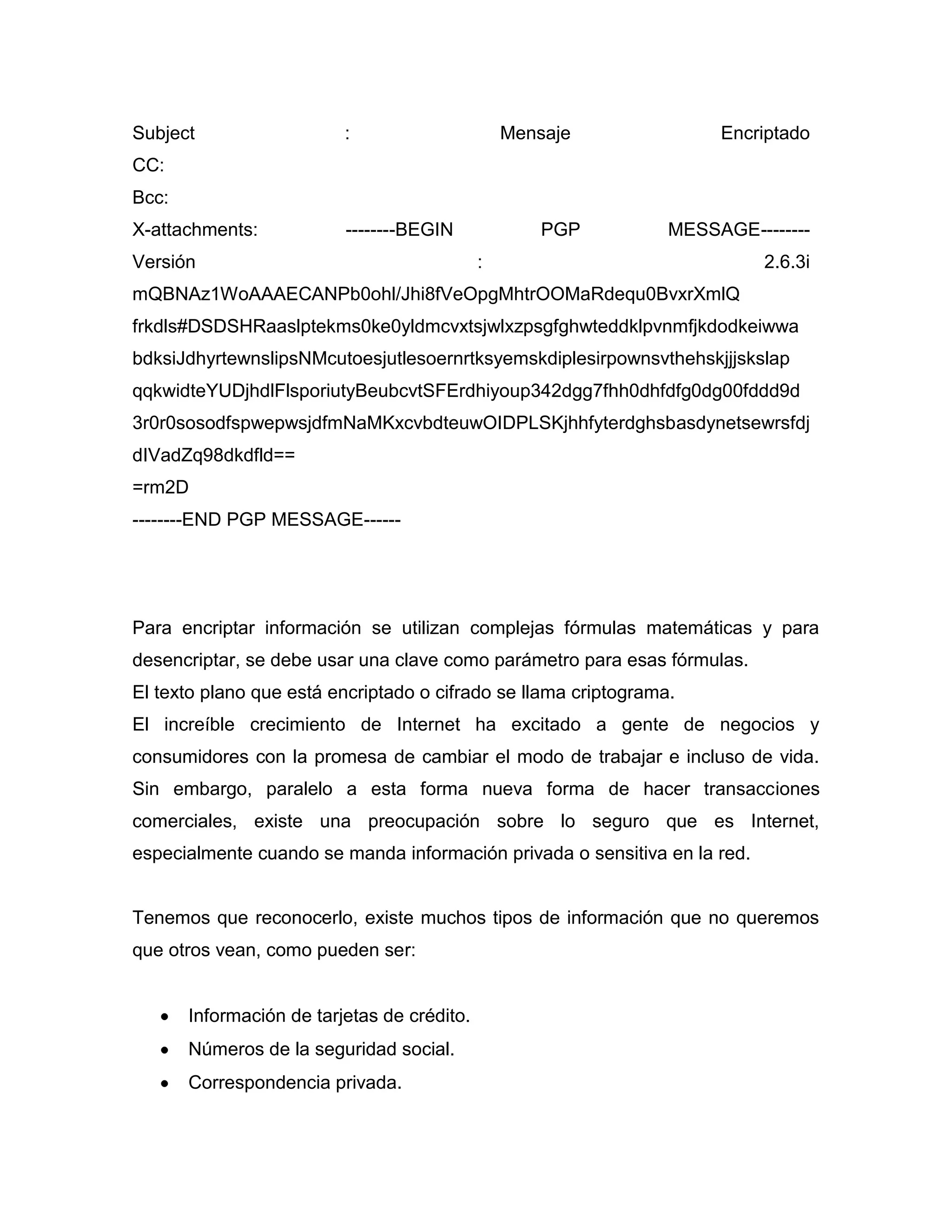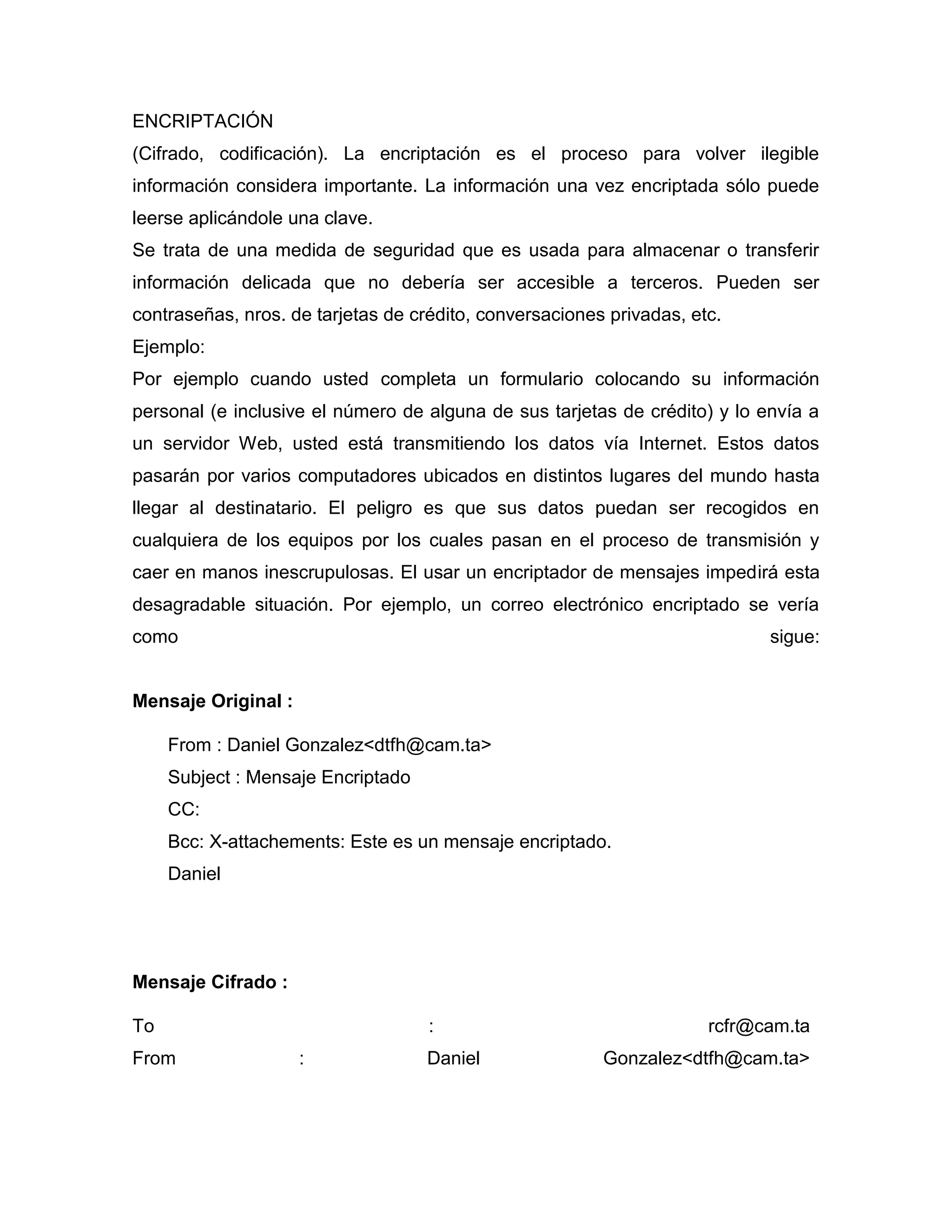 El documento habla sobre la encriptación como un proceso para volver ilegible la información para protegerla. La encriptación usa claves matemáticas para codificar la información de tal forma que solo alguien con la clave correcta puede descifrarla. Algunos ejemplos de encriptación incluyen el cifrado de contraseñas, números de tarjetas de crédito y conversaciones privadas para su almacenamiento o transmisión segura.