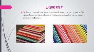 El documento describe los diferentes tipos de encuadernación a través de la historia. Explica que la encuadernación implica coser o pegar hojas de papel y agregar cubiertas. Durante la antigüedad, los libros se guardaban en cajas de madera o metal. En la Edad Media había tres tipos principales de encuadernación: sencilla, elegante y de gran lujo. En la Edad Moderna se desarrollaron nuevas técnicas como el uso de cartón y tela. Hoy en día existen varios estilos como rú
