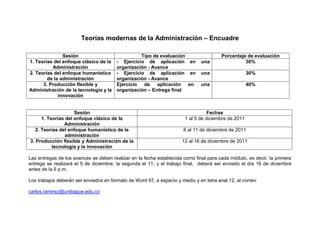 Este documento presenta el plan de estudios para un curso sobre teorías modernas de administración. El curso se divide en tres sesiones que cubren teorías clásicas, humanísticas y de producción flexible, cada una con ejercicios de aplicación y porcentajes de evaluación. Los estudiantes deben enviar los avances de cada sesión en las fechas indicadas y el trabajo final el 16 de diciembre al correo del profesor.