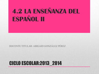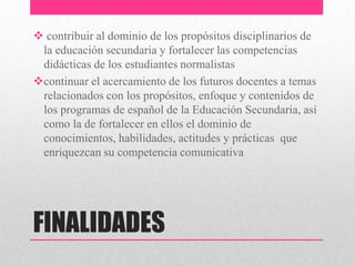 Este documento presenta la información sobre un curso de Español II para estudiantes normalistas. El curso se enfoca en profundizar el conocimiento de los estudiantes sobre el Enfoque Comunicativo y Funcional para la enseñanza del español. El curso también examina la organización de los programas de estudio de español de la educación secundaria y estrategias didácticas para trabajar con contenidos de lengua hablada, lengua escrita, y recreación literaria. El curso se divide en tres bloques y evalúa a los estudiantes basado