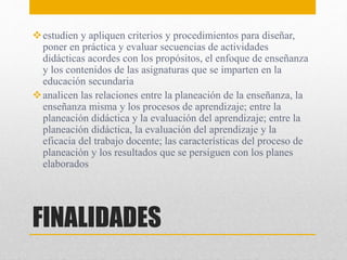 Este documento presenta la planeación de una asignatura sobre planeación de la enseñanza y evaluación del aprendizaje. Incluye las finalidades y propósitos de la asignatura, que son estudiar criterios y procedimientos para diseñar y evaluar actividades didácticas, y analizar las relaciones entre la planeación, enseñanza y aprendizaje. También presenta los bloques temáticos a cubrir, las políticas de clase, y criterios de evaluación.