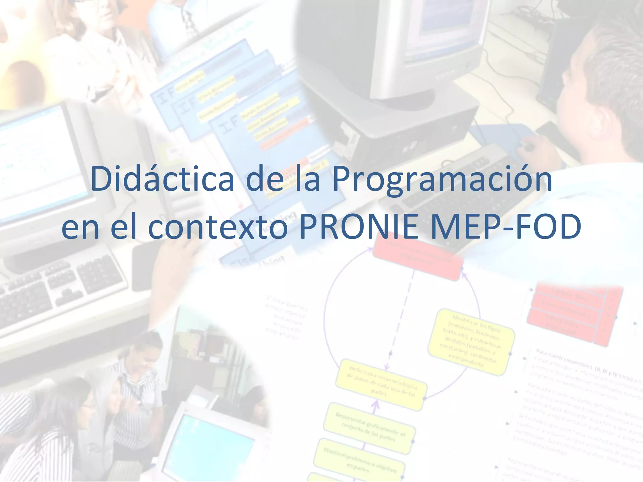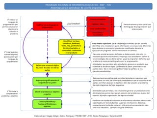 Este documento presenta los objetivos de un taller sobre la didáctica de la programación en el contexto del Programa Nacional de Informática Educativa del Ministerio de Educación Pública de Costa Rica. El objetivo general es que los educadores comprendan el proceso de andamiaje para el aprendizaje de y con la programación a través de nuevas herramientas. Los objetivos específicos incluyen conocer el concepto de programación en este contexto, comprender la didáctica de la programación desde la perspectiva del aprendiz y mediador, y construir product