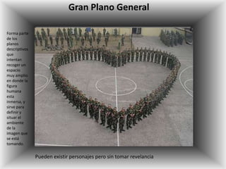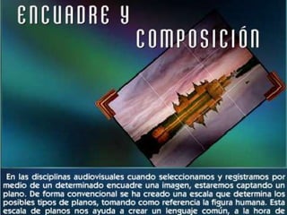 Este documento describe diferentes tipos de planos y ángulos utilizados en fotografía y cine para capturar imágenes. Explica planos como el plano general, plano medio, primer plano y primerísimo primer plano. También describe ángulos como el normal, picado, contrapicado, cenital y nadir. Por último, introduce conceptos como la regla de los tercios, la regla del horizonte y la regla de la mirada.