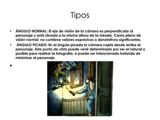 El documento habla sobre diferentes técnicas de encuadre, ángulo, composición y planos en fotografía. Explica ángulos como el normal, picado, contrapicado, cenital y nadir y cómo afectan la percepción de la imagen. También discute el encuadre, la composición mediante elementos como la claridad y regla de los tercios, y el uso de la perspectiva, superposición, profundidad de campo y efectos atmosféricos.