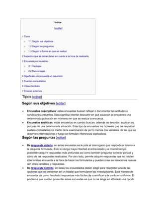 El documento describe los diferentes tipos de encuestas según su objetivo, las preguntas y la forma de realizarse. Existen encuestas descriptivas y analíticas según su objetivo, de respuesta abierta o cerrada según las preguntas, y por correo, teléfono o personal según la forma de realizarse. Las encuestas son una técnica cuantitativa que utiliza preguntas estandarizadas a una muestra representativa para medir cualidades de una población.
