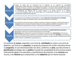 Un conjunto de tareas, responde a una serie de actividades en vistas a una serie de objetivos, que forman un proyecto; un grupo de proyectos de similar naturaleza forma un programa, el cual interrelacionado con otros, conforma un plan, que documenta la planificación estratégica de un política. El grado de complejidad de este proceso estará íntimamente ligado a la naturaleza y características del proyecto: a los recursos que insuma, a los factores que comprometa y a los objetivos que se intente alcanzar.