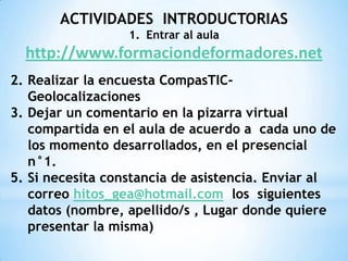 Este documento presenta las actividades de un módulo sobre geolocalización y el uso de la herramienta Umapper. Los estudiantes aprenderán a crear mapas colaborativos en Umapper organizando conocimientos sobre un tema seleccionado. Deberán incluir ejemplos, contraejemplos, diferencias y similitudes sobre el tema. Finalmente, planificarán una secuencia didáctica aplicando lo aprendido.