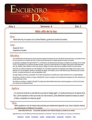 Este documento presenta las lecturas y reflexiones diarias de una persona sobre la sabiduría judicial, la propiedad privada, la restitución y la justicia según se describe en el Éxodo. Se analizan pasajes sobre las leyes de justicia, la protección de los débiles, y los peligros de ceder a la presión del entorno pagano. Finalmente, se medita sobre el pacto entre Dios e Israel y la necesidad de obediencia y entrega voluntaria al Señor.