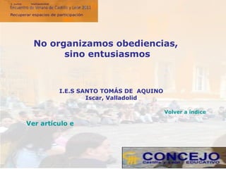 Este documento presenta resúmenes de diez experiencias de proyectos de intervención presentados en el Encuentro de Verano 2011 de Concejo Educativo de Castilla y León. Los proyectos abordan temas como la participación estudiantil, la convivencia, la igualdad, la educación ambiental, el aprendizaje y las TIC. Cada resumen describe brevemente los objetivos, actividades y logros del proyecto correspondiente.