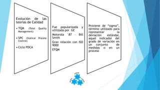 Este documento proporciona una introducción al concepto de Seis Sigma, incluyendo su evolución a partir de teorías anteriores de calidad como TQM y SPC, así como sus métricas clave como índice Z, índice DPU, índice DPO y DPMO. Seis Sigma busca identificar las causas de errores en los procesos para lograr una efectividad del 99.97% mediante el uso de estas métricas estadísticas.
