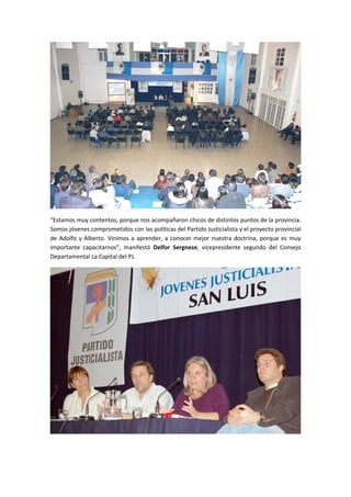 Más de 300 jóvenes asistieron a un seminario sobre peronismo organizado por la agrupación Jóvenes Justicialistas en la sede del Partido Justicialista en San Luis. Funcionarios provinciales y municipales estuvieron presentes. El legislador Marcelo Amitrano inauguró la capacitación con una explicación histórica de la doctrina peronista y las políticas aplicadas en Argentina y San Luis. Luego, Graciela Mazzarino y Graciela Corvalán analizaron las políticas de San Luis en base a las tres banderas peronistas de soberanía