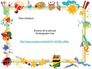Este documento describe una actividad de encuentro-taller entre docentes y alumnos de nivel inicial en una sala de psicomotricidad. El objetivo es analizar una escena de la película Kindergarten Cop para reflexionar sobre la conducta del adulto y su rol, y encontrar estrategias que ayuden a los niños a comprender los límites entre lo permitido y lo prohibido. La sala de psicomotricidad se presenta como un espacio simbólico y lúdico donde el docente pone las reglas y acompaña a los niños en sus recor