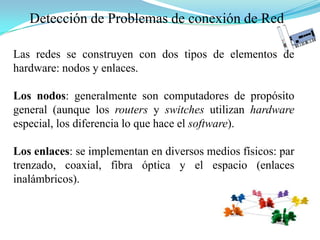 Este documento describe los componentes básicos de una red, incluyendo nodos, enlaces, tarjetas de red y diferentes tipos de cableado. Explica cómo funcionan las tarjetas de red y los diferentes medios de transmisión como par trenzado, coaxial y fibra óptica. También cubre herramientas de diagnóstico de red como Ping y Tracert y problemas comunes como drivers de red incorrectos.