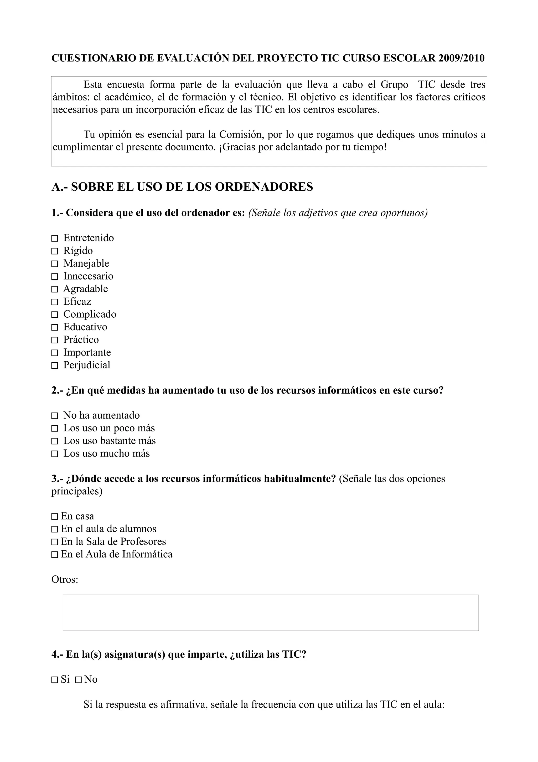 Este cuestionario evalúa el proyecto TIC del curso escolar 2009/2010 desde tres perspectivas: académica, de formación y técnica. Su objetivo es identificar los factores críticos para una efectiva incorporación de las TIC en los centros escolares. Se pide a los encuestados que dediquen unos minutos a completar el cuestionario, ya que sus opiniones son esenciales para la comisión. El cuestionario contiene preguntas sobre el uso de ordenadores, formación recibida, plataforma educativa Helvia, coordin