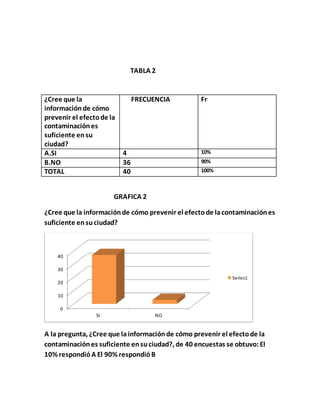 El documento presenta los resultados de una encuesta sobre temas ambientales realizada a 40 personas. La mayoría de los encuestados considera que la contaminación ambiental es un problema actual y que dar buen manejo a los desechos domésticos ayuda a preservar el medio ambiente. Sin embargo, la mayoría también opinó que la información disponible sobre cómo prevenir los efectos de la contaminación no es suficiente en su ciudad.