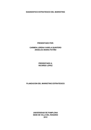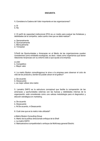 Este documento presenta los resultados de una encuesta realizada a 10 personas sobre conceptos relacionados con el diagnóstico estratégico de marketing. La mayoría de los encuestados consideraron que la cadena de valor y la matriz DAFO son importantes para las organizaciones. También respondieron que el perfil de capacidad institucional debe realizarse trimestralmente y que la matriz más utilizada es la DAFO.