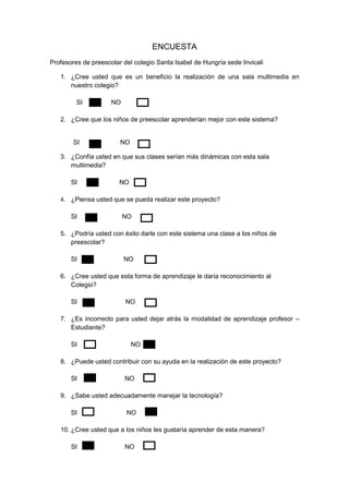 El documento presenta una encuesta de 10 preguntas realizada a los profesores de preescolar del colegio Santa Isabel de Hungría sede Invicali para evaluar su opinión sobre la posible implementación de una sala multimedia en el colegio. Las preguntas indagan sobre los posibles beneficios educativos de la sala multimedia, la capacidad de los profesores para usarla efectivamente y si el proyecto debería llevarse a cabo.