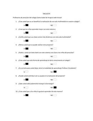 Una encuesta realizada a profesores de preescolar del colegio Santa Isabel de Hungria en Invicali exploró sus opiniones sobre la posible implementación de una sala de aprendizaje multimedia. La mayoría de los profesores creían que la sala multimedia beneficiaría a los estudiantes y mejoraría la dinámica de sus clases, y que los niños disfrutarían aprendiendo de esta manera. Sin embargo, algunos profesores tenían reservas sobre dejar de lado el modelo tradicional de aprendizaje centrado en el profesor.